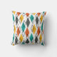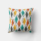 This throw pillow has a mid-century modern design of diamonds in orange, yellow, turquoise, grey, and outlined scattered throughout on a field of white.