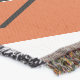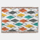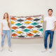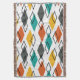 This throw blanket has a mid-century modern design of diamonds in orange, yellow, turquoise, grey, and outlined scattered throughout on a field of white.