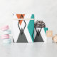 This wrapping paper has a mid-century modern design of diamonds scattered about in orange, gold, turquoise, grey, and outlines on a field of white