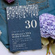 A modern, elegant and classy 30th birthday party invitation template for women featuring a denim background, a fringe of pearls and diamonds (these are digital effect) and modern typography in pearl white. A chic "diamonds and pearls" theme design for a woman turning thirty, on her thirtieth birthday. A classy bling party for a glam milestone.