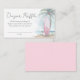 On the right side, the watercolor artwork features a pink surfboard standing upright beside a green palm tree, with soft sand and light ocean water in the background. The hand-painted style gives it a breezy, coastal feel, and the back of the card is blush pink for a soft, charming finish.