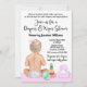 Diapers and wipes baby shower invitation with adorable baby girl with toys on a cute pink dot background.
