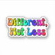 A rainbow retro typography design with the words "Different, Not Less" to support and promote neurodiversity awareness and autism acceptance.