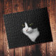 Hard to solve cat on solid black jigsaw puzzle. It features an image of a cute black and white kitty set against a dark background. This fun and challenging puzzle is perfect for cat lovers who enjoy solving difficult puzzles.