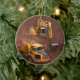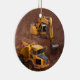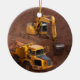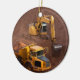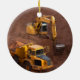 This cool ornament features a photo of a yellow digger tractor and a dump truck.