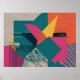 This artwork fuses a nostalgic digital aesthetic with crisp modern minimalism. Hot pinks, deep teals, mustard yellow, and punchy oranges form intersecting planes over textured grey surfaces, simulating wood grain or analogue scan lines. Grids, stripes, and partial halftone patterns contribute to a sense of retro-tech disruption—as if this were a signal glitch turned into visual poetry.