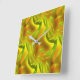 Stamped of enlarged abstract drawing reminiscent of green cutouts on a background with digital scratches in texture in intense yellowish orange and lime-green reminiscent of an orange fruit and its leaves or part of its skin still in ripening.