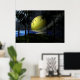Digital art of Saturn setting behind an ocean and palm trees. This art was fully developed in 3d programs!