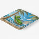 Big green dill pickle hanging between two tropical palm trees on a beach with flip-flops.