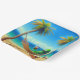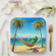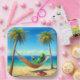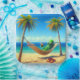 Big green dill pickle relaxing in a hammock with a tropical cocktail hanging between two tropical palm trees on a beach with flip-flops.