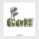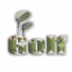 Pictured in a dimensional design is the word golf with two golf clubs behind it