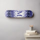 Reminiscent, of a Moroccan-style carpet, this abstract, monogram design, is displayed in-glowing colours, of navy-blue, lavender, black, and white.