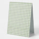 This table top sign has a watercolor image of a crest surrounded by floral branches with green and pink gingham pickleball paddles in the centre. Text says "Dinks and Drinks." Colours used include moss green, blush pink and and tan. There is a green gingham pattern on the back.