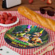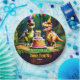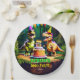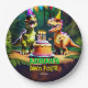 Dino four colourful dinosaur birthday party tableware personalised template party plates, dinosaurs wearing party hats with a birthday cake dinosaur birthday plates