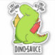 Dino-Sauce Funny Dinosaur Pun features a cute dinosaur with his favourite mustard and ketchup sauce bottles. Perfect pun gift for family and friends who love cute dinosaur puns.