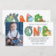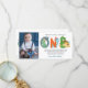 Modern, simple and elegant boy first birthday thank you card. Design featuring Dino script one , thank you message and a photo. Perfect as a thank you for Dinosaur themed first birthday party.