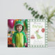 Watercolor kids birthday party. Watercolor Dino with birthday hat, cake with candles, red balloon. Green cage background.