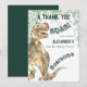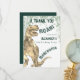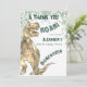 A unique way of saying thank you with a T-rex dinosaur roar for making a birthday party roarsome. Fun dinosaur jungle 5th birthday party thank you card easy to personalise with modern green typography templates. Tyrannosaurus rex and prehistoric Jurassic jungle foliage. Original dino artwork and greenery watercolor by artist Catherine Sweetman