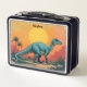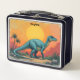 A blue dinosaur in a prehistoric landscape with palm trees and a big, yellow sun makes the perfect lunch box for the dinosaur-loving child, boy or girl.