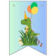 Set the scene for a roaring good time with this fun dinosaur birthday bunting party banner! Featuring two cheerful dinosaurs in party hats (one carrying a gift), a baby dino hatching from its egg, and a pterodactyl soaring overhead, this banner is filled with festive details like balloons, palm leaves, and bright colours.