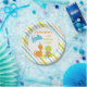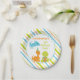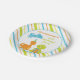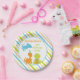 This cute dinosaur paper plate has an orange, green, and blue stripes edge with a white centre. There are two dinosaurs at the bottom with a blue flying dino to the left. On the right, you can easily customise the text!