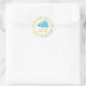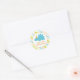 This cute dinosaur sticker has an orange, green, and blue stripes background. In the middle, there's a circle with a blue dinosaur with a party hat on his head. Below the dino, you can easily personalise the text!