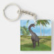 3D digital render of a dinosaur Brachiosaurus on background of blue sky and green palm trees