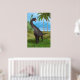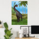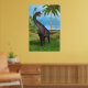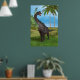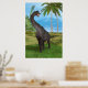 3D digital render of a dinosaur Brachiosaurus on background of blue sky and green palm trees