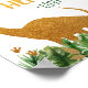 The design features gold dinosaur silhouettes with tropical watercolor leaves and gold foil leaf embellishments.
