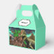 A modern, fun and eye-catching design featuring prehistoric Tyrannosaurus rex and wooly mammoth animals surrounded ancient stone rocks, flying pterodactyls, palm trees and the aurora borealis. The top lid has a scalloped banner on which a bold black template appears for your custom wording and / or names. Feel free to change the background colour to any of your choice. Your son will love these dinosaur themed party favours.