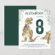 Celebrate the child that loves dinosaurs turning eight with this Roaring T-Rex and cute stegosaurus inviting Dino fans to a 8th birthday party. Personalise this Tyrannosaurus and stegosaurus Jurassic jungle invitation by adding the name of the birthday boy or girl, the number of the birthday and the party details and you are all set for a fun packed dinosaur green themed dino birthday. All dinosaur species are welcome. Prehistoric jurassic era Dinosaur illustrations, original artwork by artist by Catherine Sweetman