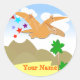 Dinosaur Pteranodon Name Stickers. A cute happy smiling orange colour dino Pteranodon in a bright pre-historic stone age landscape with palm trees, mountains and vulcano shooting stars in the blue sky with some white clouds round sticker with Your Name. Fill in your name to personalise your unique special dino sticker with your name! This dinos sticker is fully customisable, add your text(s) and image. Great back to school cartoon dinosaur stickers or birthday gifts stickers for the little and big dinosaur fan!
