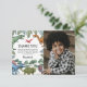 Jurassic birthday thank you card featuring a plain black backdrop, a sweet photo of your child, jungle green foliage, a collection of watercolor dinosaurs, and a modern personalised thank you template that is easy to customise.