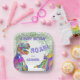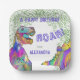 Colourful Dinosaur T-rex and stegosaurus with Jurassic jungle foliage watercolor Happy Birthday Roar paper plate. Ideal for girls dino birthday parties especially Jurassic jungle themed celebrations. The words ‘ A Happy Birthday Roar for’ with a custom child’s name. Modern fun dark green and purple typography that’s easy to personalise using the template. Original artwork by artist Catherine Sweetman