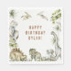 Cool dinosaur theme, birthday party paper napkins. Watercolor prehistoric foliage and dinosaur border.