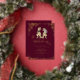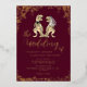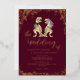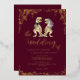 Celebrate your big day with a roar! This unique dinosaur-themed wedding invitation features a whimsical T-Rex bride and groom design, perfect for couples who love dinosaurs and want a playful twist on traditional wedding stationery. Set against a rich deep burgundy background, the invite is adorned with elegant gold foil script and gold eucalyptus foliage for a modern stylish look.