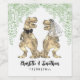 Perfect for a dinosaur themed wedding, delight your guests with these funny dinosaur bride and groom and watercolor eucalyptus foliage custom wine labels. Fun T-Rex dino bride and groom in brown hues and green watercolor botanical greenery with easy to personalise bride and grooms names and the wedding date in modern whimsical typography script. Unique original dino artwork by artist Catherine Sweetman