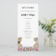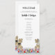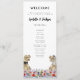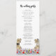 Funny dinosaur themed wedding day program with dinosaur bride and groom in a colourful prehistoric wildflower meadow. Easy to customise with the bride and grooms names, the wedding date and all the wedding day ceremony details in modern typography script. Fun T- Rex bride and groom dino and watercolor wildflower illustrations in blue pink purple orange yellow red and green hues. Unique original dinosaur and floral artwork by artist Catherine Sweetman