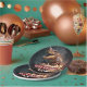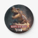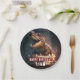Birthday paper plates featuring a dinosaur themed birthday cake. And "Happy Birthday", all-caps bold font. Customise it by adding your name(s).