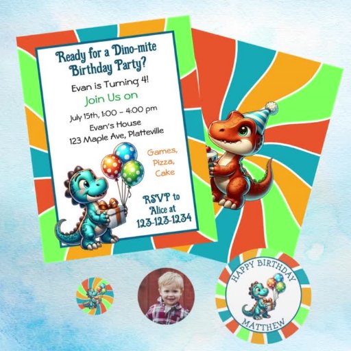Adorable Personalised Boy's Birthday Party banner. Cute dinosaur theme in blue, orange and green. Cute cartoon dinosaurs holding balloons and birthday cake. Add name, age and picture in the personalise area.