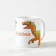 A great prehistoric velociraptor Jurassic era dinosaur mug for the boy or girl who loves dinos, Colourful velociraptor Dinosaurs illustration and name, just add a boys or girls name to this fun mug to personalise. Prehistoric jurassic era dinosaur in bright colours including green orange and yellow on a green background. Original artwork by artist Catherine Sweetman.