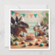 An imaginative illustration of Stegosaurus dinosaurs at a party with cake and party hats, a great card for dinosaur lovers,