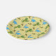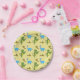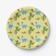 Yellow paper plates with blue dinosaurs, green dinosaurs and brown pterodactyls on a yellow background. Background colour of plates can be customised. These go great with our matching paper cups and party hats.