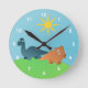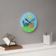 Cute and playful graphic Brontosaurus and Triceratops dinosaurs standing on a green hill in the sunshine. This adorable dinosaur themed wall clock would be wonderful decor for a young boys bedroom or child's nursery.