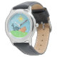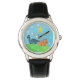 Cute and playful graphic Brontosaurus and Triceratops dinosaurs standing on a green hill in the sunshine. This adorable dinosaur themed wrist watch would be a wonderful gift for a young boys.