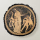 16” round throw pillow with an image, on both sides, of Dionysus, Greek god of wine and wine making and ritual madness, and the satyrs on black. In Greek mythology, a satyr is a wood-dwelling creature with the head and body of a man and the ears, horns, and legs of a goat. Satyrs were chraacterised as being fond of lechery and drunken merriment. See matching 20” x 20” throw pillow and 13” x 21” lumbar pillow. See the entire Toga Pillow collection in the DECOR | Pillows section.