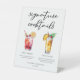 This chic signature cocktails menu pedestal sign features custom black typography above 2 drinks and their ingredients for your wedding bar. A cute Dirty Shirley Temple and Piña Colada drawing add a cool flair to your bar menu. Complete with the couple's names and date for their reception.