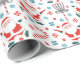 Disc golf Christmas holiday gift wrap featuring Santa Claus playing frisbee golf surrounded by snowflakes and Christmas candy.