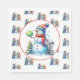 Disc golf themed Christmas party paper napkins.. Disc golf themed art. Cute watercolor cartoon snowman in Santa hat next to a disc golf basket in the snow next to a Christmas tree.