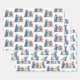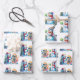 Holiday wrapping paper with snowmen standing next to dics golf baskets in snowy winter scenes.